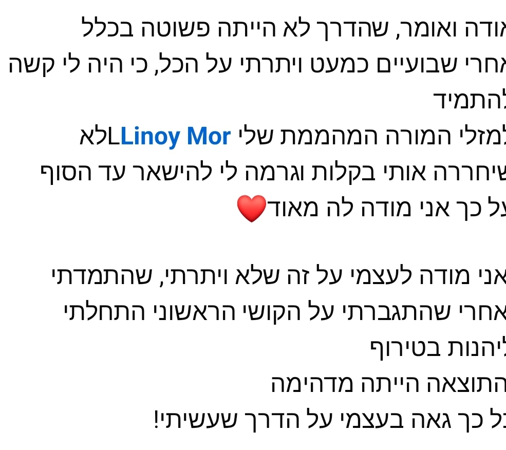 " כל הצלחה גדולה מתחילה בצעד קטן ובאמונה בדרך. עם מחויבות, השקעה ועבודה קשה, אין גבול למה שאפשר להשיג. זו ההזדמנות שלך ליצור שינוי, להעניק ערך ולהשאיר חותם בעולם "
